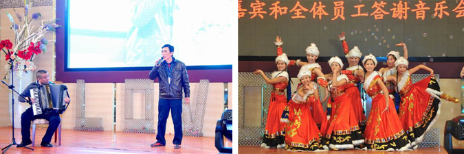 “2011年銷售突破億元(10656萬(wàn)元)”湯姆嘉賓和全體員工答謝音樂會(huì),湯姆董事長(zhǎng)湯建華為湯姆員工芮正春演唱的《我的老婆并不美》作手風(fēng)琴伴奏(左圖);常州幼兒師范學(xué)校舞蹈隊(duì)為湯姆公司獻(xiàn)上民族舞《唐古拉》(右圖)